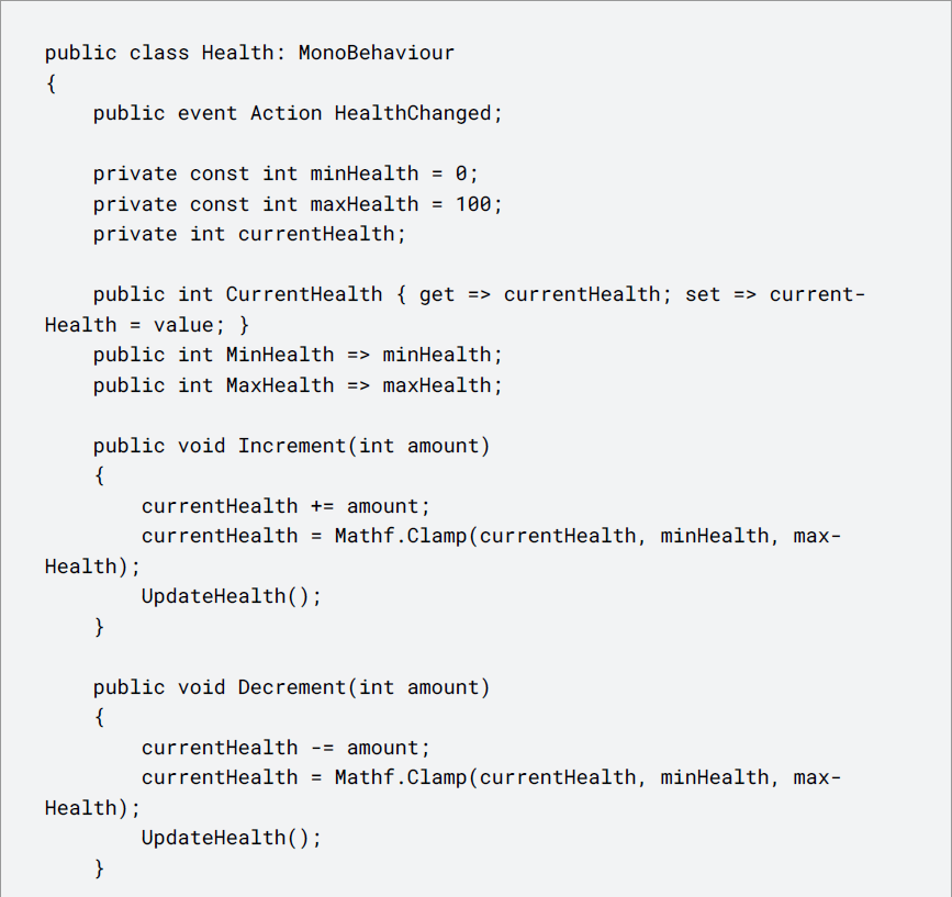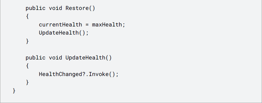 이 예제에서 Health는 Model로 작용한다. 실제 체력 값을 저장하고, 값이 변경될 때마다 이벤트인 HealthChanged를 호출한다. Health는 게임플레이 로직을 포함하지 않고, 데이터를 증가시키고 감소시키는 메서드만 포함한다.