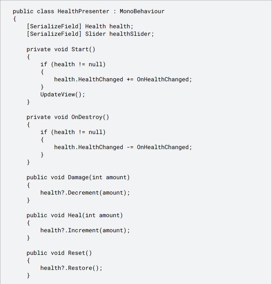다른 게임 오브젝트들은 Damage, Heal 및 Reset을 사용하여 체력 값을 수정하기 위해 HealthPresenter를 사용해야 하며, 평소에 HealthPresenter는 유저 인터페이스를 업데이트하기 위해 Health가 HealthChanged 이벤트를 발생시킬 때까지 기다린다.