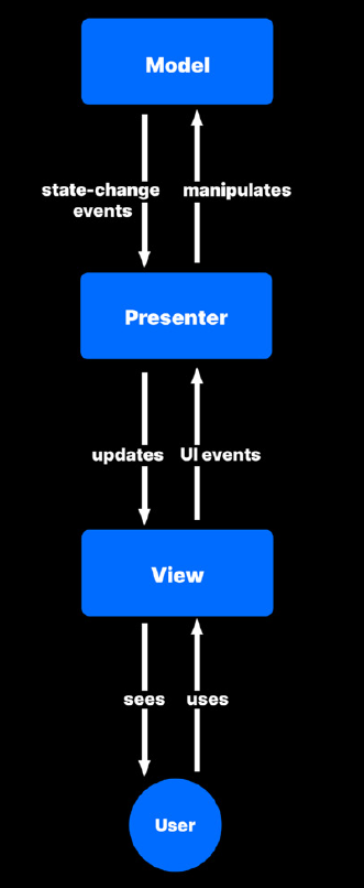 MVP에서 Presenter는 마치 MVC의 Controller와 비슷하지만, Controller와 다르게 다른 레이어들 간의 매개체 역할을 수행한다. 또한 MVC에선 Controller가 입력을 처리했지만 MVP에선 View가 입력을 처리한다.