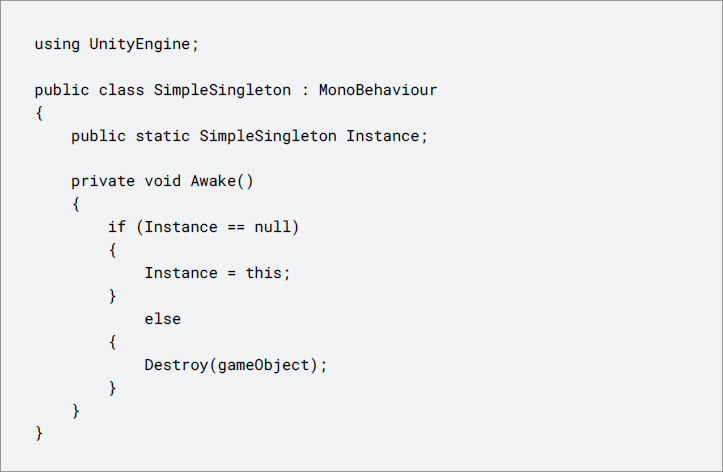 싱글톤을 사용하여 게임 플로우 매니저나 오디오 매니저와 같은 다른 게임 오브젝트에서 항상 접근 가능한 매니저 오브젝트를 만들 수 있다. 이를 위해 프로젝트에 싱글톤을 사용하기로 결정했다면 그것을 최소한으로 유지해라. 무분별하게 사용하지 않고, 전역 액세스에서 이점을 얻을 수 있는 소수의 스크립트에만 싱글톤을 보존해야 한다.