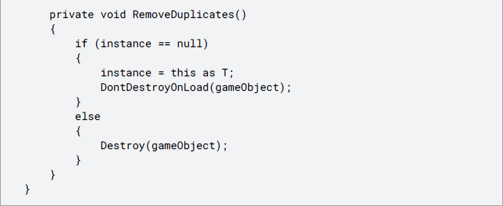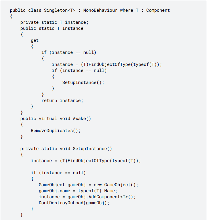 가령 오디오 매니저로 작동하는 싱글톤과 게임 매니저로 작동하는 다른 싱글톤이 필요한 경우, 위 코드로서는 두 싱글톤이 함께 존재할 수 없다. 여러 싱글톤이 존재하게 하려면 싱글톤으로 만드려는 각 클래스에 관련 코드를 복제해야 할 것이다.