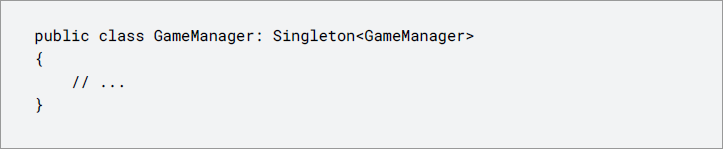 이렇게 함으로써 어떤 클래스도 싱글톤으로 만들 수 있다. 그저 클래스를 선언할 때 위의 generic 싱글톤을 상속시키면 된다. 가령 GameManager라는 Monobehaviour를 다음과 같이 싱글톤으로 만들 수 있을 것이다.