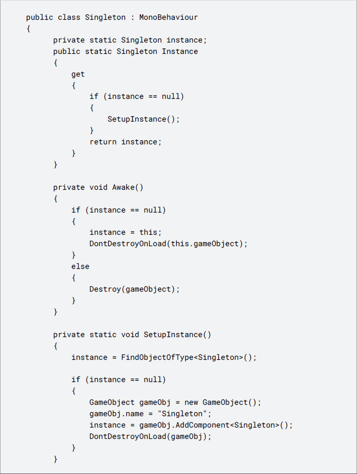 더 나아가 lazy instantiation을 사용하여 싱글톤이 실제로 처음 필요할 때 자동적으로 셋업할 수 있다. 이를 위해선 빈 게임 오브젝트를 생성하고 적절한 싱글톤 컴포넌트를 붙이는 로직만 있으면 된다.